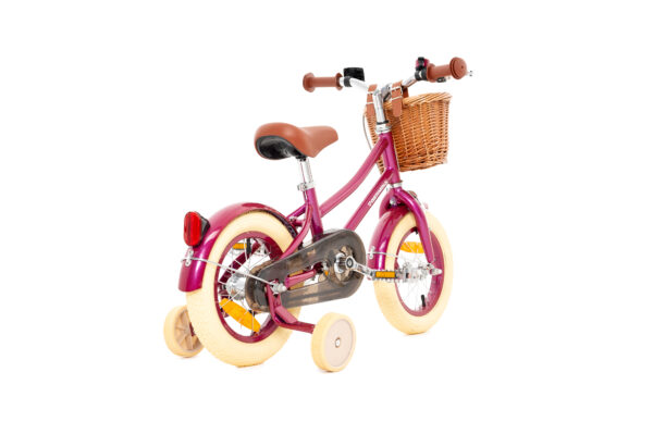 Ten stylowy rowerek został wyposażony w szerokie i stabilne kółka podporowe, błotniki i wiklinowy koszyk.