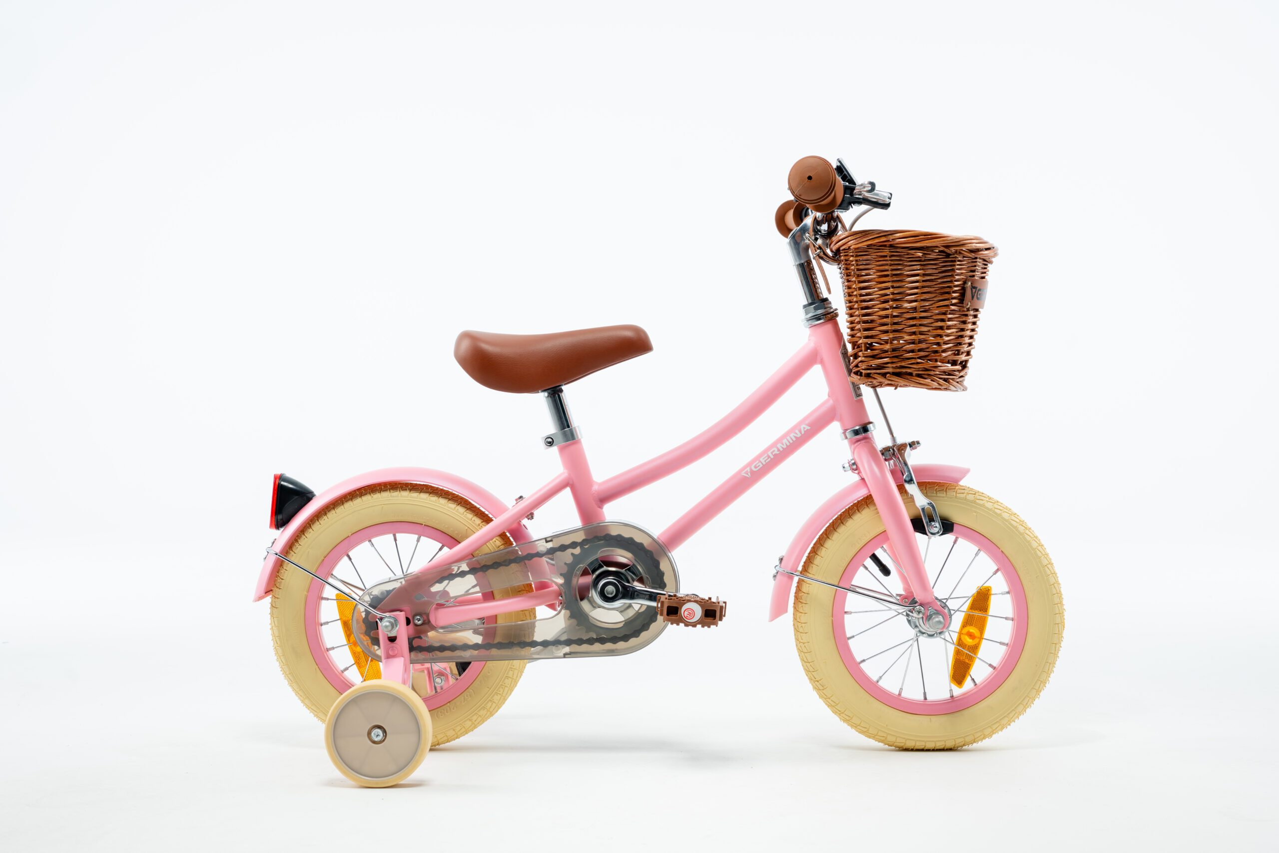 Ten stylowy rowerek został wyposażony w szerokie i stabilne kółka podporowe, błotniki i wiklinowy koszyk.