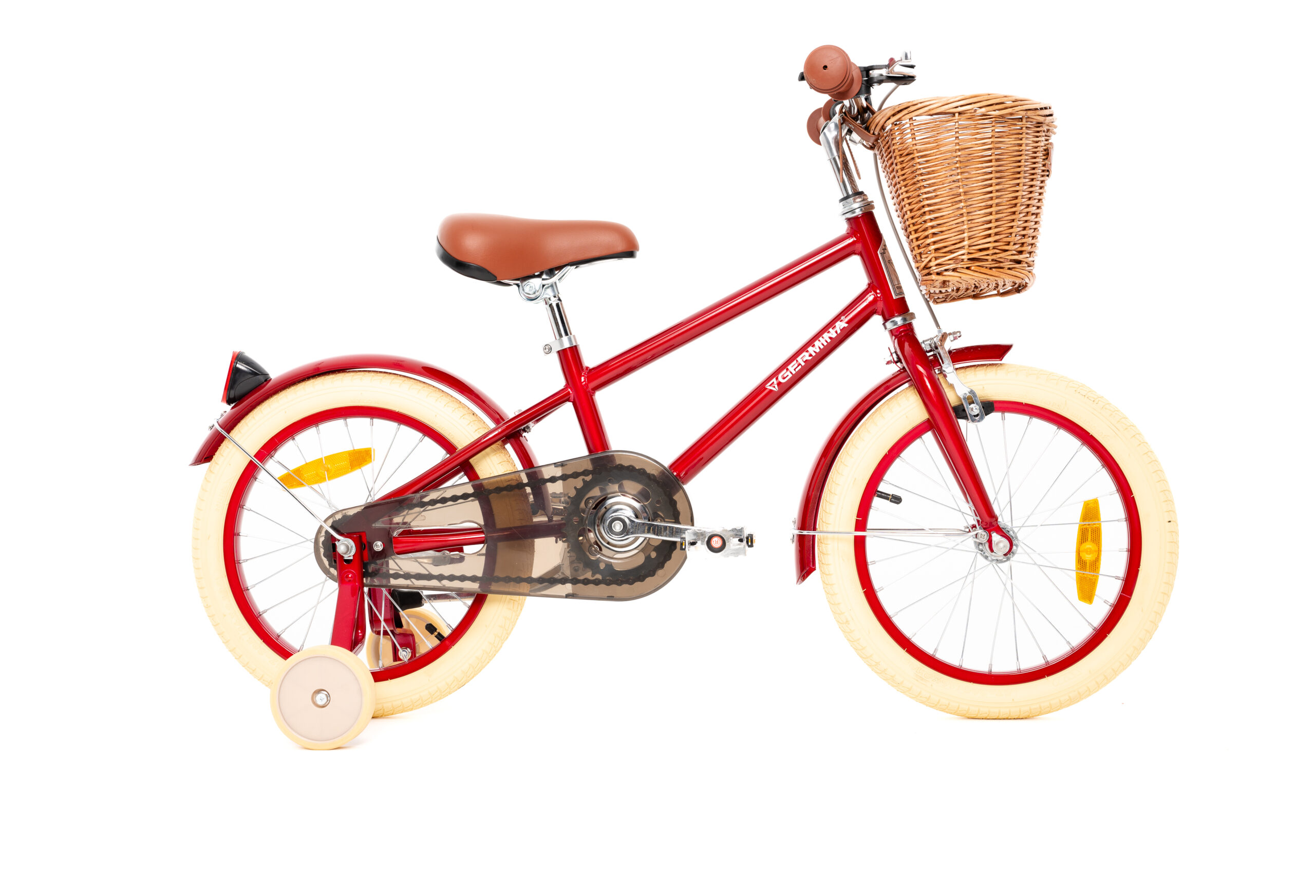 Ten stylowy rowerek został wyposażony w szerokie i stabilne kółka podporowe, błotniki i wiklinowy koszyk.